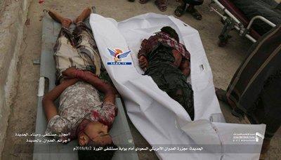 صعدة برس - وصلت جثامين 42 شهيدا إلى مستشفى الثورة والمستشفيات الأخرى بمدينة الحديدة إثر مجزرتي طيران العدوان اليوم، أمام بوابة مستشفى الثورة وحراج السمك بمحافظة الحديدة.