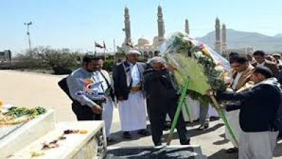 صعدة برس - وضع وزير الاتصالات وتقنية المعلومات المهندس مسفر عبد الله النمير ومعه وكيلا الوزارة نبيل العياني والمهندس هاشم الوشلي اليوم إكليلاً من الزهور على ضريح الرئيس الشهيد صالح الصماد ورفاقه بميدان السبعين بالعاصمة صنعاء.