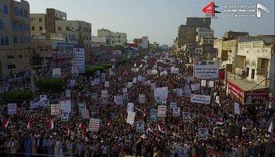 فيما أشاد القائم بأعمال محافظ الحديدة بتفاعل أبناء المحافظة الذين توافدوا إلى الساحة من كل مديرية وعزلة وقرية، لتوجيه رسالة للعدوان بإستمرار صمود اليمنيين في مواجهته.