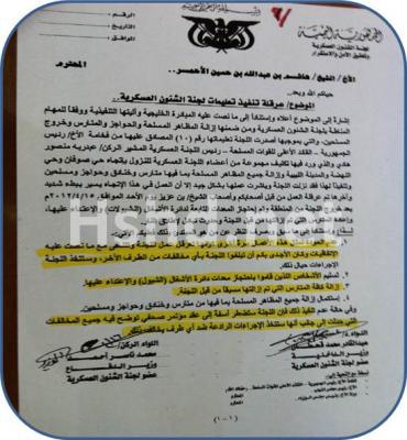 وفي الوثيقة التالية التي حصل عليها موقع حشد نت .. يثبت وبما لا يدع مجالا للبس او الشك بأن اللجنة العسكرية قد نفذ صبرها بشأن رفض وممانعة اولاد الاحمر للجنة العسكرية في تنفيذ مهامها .. وهو ما يدحض كل البيانات والتصريحات الذي نشرت عن ابناء الاحمر والذي ادعوا خلالها التزامهم بقرارات رئيس الجمهورية رئيس اللجنة العسكرية ..