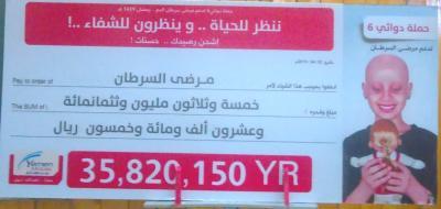 حيث قامت شركة (يمن موبايل) للهاتف النقال صباح اليوم الاثنين بتوزيع مبلغ (35) مليون، و(820)ألف، و(150) ريال لصالح مرضى السرطان في اليمن هو حصيلة عائدات حملة دوائي6 التي اطلقتها الشركة في رمضان قبل عدة اعوام تحت شعار (اشحن رصيدك حسنات).