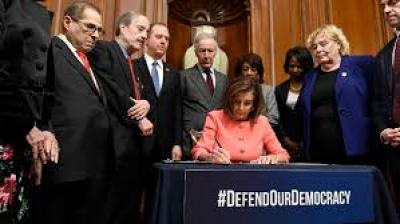 وقبيل توقيعها القرار الاتّهامي الذي وجّه بموجبه مجلس النواب إلى الرئيس الجمهوري تهمتي إساءة استخدام السلطة وعرقلة عمل الكونغرس، قالت بيلوسي "من المحزن والمأساوي للغاية بالنسبة إلى بلدنا أنّ الإجراءات التي اتّخذها الرئيس لتقويض أمننا القومي وانتهاكه اليمين الدستورية التي أدّاها وتعريضه أمن انتخاباتنا للخطر، قادتنا إلى هذا المكان".