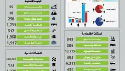 كما بينت إحصائية المركز أن تحالف العدوان الغاشم دمر8،460 بنية تحتية، و21،241 منشأة اقتصادية، و466،973منشأة خدمية، و173 منشاة جامعية، و46 منشأة إعلامية، و385 مستشفى ومرفقاً صحياً 6،398حقلا زراعيا، و129 منشاة رياضية، و1،330 مسجداً، و1،068مدرسة ومركزاً تعليمياً ، و354 منشأة سياحية، و241 موقعاً أثرياَ. |