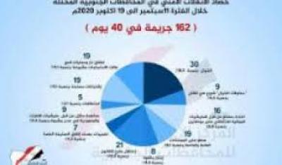 وأكد أن إجمالي الجرائم والانتهاكات التي طالت المواطنين من الجنسين بالمحافظات الجنوبية المحتلة التي تم رصدها بلغت 162 جريمة منها 30 جريمة اغتيال وتسع محاولات اغتيال طالت بعض قيادات أطراف الصراع.