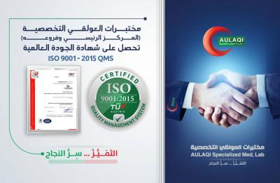 وجاءت هذه الشهادة لمختبرات العولقي إستحقاقاً لها كأول مختبرات طبية في اليمن تحصل عليها لقاء اجهزتها التكنولوجية الحديثة التي تمتلكها وخدماتها وذلك لتعزيز مبدأ القيادة، وإدارة المخاطر واستمرارية الأعمال بمعيار الجودة ونجاح وفقاً للشركة كجهة دولية مانحة.