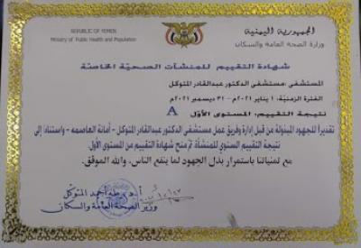وهنأ كادر مستشفى الدكتور عبد القادر المتوكل الطبي والإداري مديره العام د.غسان عبد القادر المتوكل ورئيس مجلس إدارة المستشفى بتبريكات حاره بحصول المستشفى على هذا التصنيف في تقييم وزارة الصحة.
