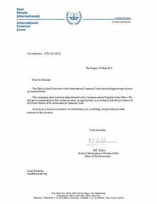 مكتب المدعي العام للمحكمة الجنائية الدولية يعترف استلام الوثائق الخاصة بك / الرسالة والشكوى .