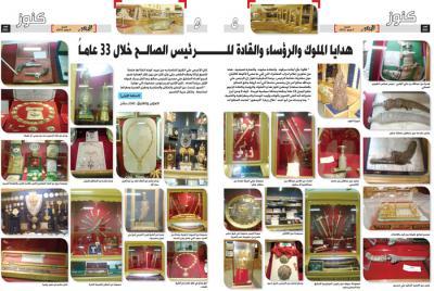 لاكوها كاللبُّان حول مقتنيات فخامة الرئيس، بينما الحقيقية تقول إن الرئيس علي عبدالله صالح أمر بأن يخصص متحفاً (في أحد أروقة جامع الصالح بالعاصمة صنعاء) ليحضن كنوز هدايا الملوك والرؤساء والقادة لزعيم حكم اليمن 33 عاماً بحكمة وحنكة سياسية فريدة.. كيف لا ومن أبرز منجزاته أنه أنهى التمييز بألوانه وأوجد الوحدة والديمقراطية والتنمية. * وما وجدناه من أبو أحمد “خلال زيارة متحف الصالح أنه كان الأحرص على الكنوز الخاصة به من غيره، كونه انشأ لها متحفاً لتصبح تراثاً يملكه الشعب حتى وإن كان من بين تلك الهدايا خنجر قديم أهداه المنشق علي محسن للرئيس صالح ربما كان يدرك فحواه الأول حينما أهداه.. لكن الأخير لم يستوعب مضمونه إلى مؤخراً. * الصور تتحدث عن الزمان والمكان والمناسبة ومغزى الهدية ومغزاها لصاحبها.. وللكل حرية التفسير.