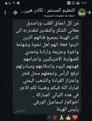 "من كل اعماق القلب وباصدق معاني الشكر والتقدير نتقدم به الى كادر الهيئة بجميع فئاتهم الذين اثبتوا فعلا انهم اهل نخوة وشهامة واخوة وعزيمة وارادة وتحدي للصهاينة الامريكيين واجرامهم فهبتهم اليوم واندفاعهم ومبادرتهم ترفع الرأس وتجعلهم محل فخر واعتزاز القيادة والشعب اليمني فبارك الله فيكم وهنيئا لكم الاجر في هذه الليالي المباركة" ..