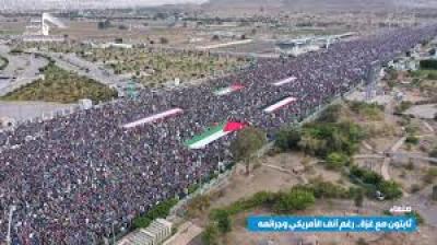ورفعت الحشود المليونية في المسيرة، العلمين الفلسطيني واليمني، وشعارات الصرخة والجهاد والمقاومة، والمؤكدة على استمرار الصمود والثبات في مواجهة العدوان الأمريكي الصهيوني، وإسناد غزة حتى تحقيق النصر.