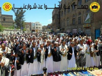 صعدة برس - للاسبوع الحادي والعشرين على التوالى أدى سكان وأهالي الأحياء المتضررة من مخيمات اعتصام أحزاب المشترك بالعاصمة صنعاء صلاة جمعة الاستغاثة على الشارع الرئيسي في حي الزراعة تنديدا بالحصار الجائر عليهم وانتهاك حقوقهم المعيشية والاقتصادية والإنسانية واحتلال احزاب المشترك لشوارعهم وحيهم السكني والتجاري منذ مطلع العام الماضي .
