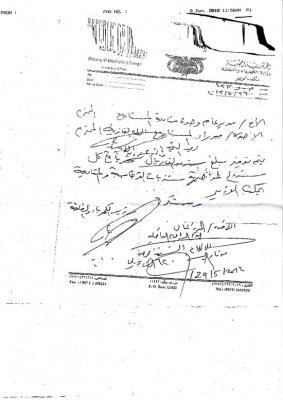 وفي المذكرة الصادرة من مكتب وزير الكهرباء صالح سميع بتاريخ 25/5/ 2012م والمذيلة بتوقيع الوزير صالح سميع يوجه الوزير كل من مدير عام وحدة المشاريع بالوزارة ومدراء المشاريع التابعة للوزارة ، بتوفير مبلغ 60.000 ريال "شهريا" عن كل مشروع لمواجهة مشتريات القرطاسية والمتابعة بمكتب الوزير "كما جاء في المذكرة".