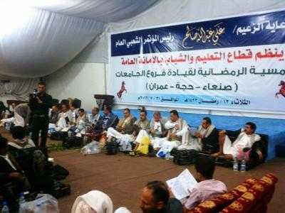 صعدة برس - برعايةالزعيم على عبدالله صالح رئيس المؤتمر الشعبي العام نظم مساء اليوم قطاع الشباب والطلاب بالأمانة العامة للمؤتمر بالعاصمة صنعاء الأمسية الرمضانية لقيادة فروع المؤتمر بجامعات (صنعاء -عمران –حجة) بحضور عدد من القيادات والقواعد المؤتمرية ورؤساء فروع المؤتمر في الجامعات.