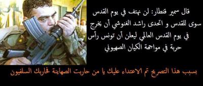 وربط البعض الاعتداء بما صرح به القنطار الذي قال: "لم نهتف في يوم القدس الا للقدس واتحدى راشد الغنوشي ان يخرج في يوم القدس العالمي ليعلن ان تونس راس حربة في مواجهة الكيان الصهيوني".