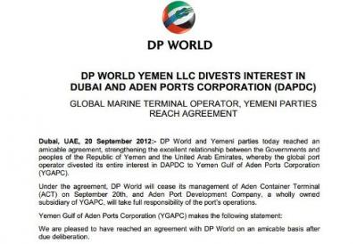 صعدة برس - توصلت موانئ دبي العالمية،مشغل المحطات البحرية العالمي،والسلطات اليمنية اليوم إلى اتفاق ودي حول ميناء عدن يعزز العلاقات الوثيقة بين حكومات وشعب اليمن ودولة الإمارات العربية المتحدة، حيث تقوم بموجبه موانئ دبي العالمية بالتخلي عن كامل حصتها في شركة دبي وعدن لتطوير الموانئ لصالح مؤسسة اليمن وخليج عدن للموانئ.