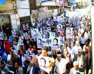 وجابت الحشود شوارع العاصمة رفع المشاركون فيها صور ولافتات تنادي بالدولة المدنية التي أسسها الشهيد الحمدي واغتالتها أيادي الجبن في 11من أكتوبر عام 77م .