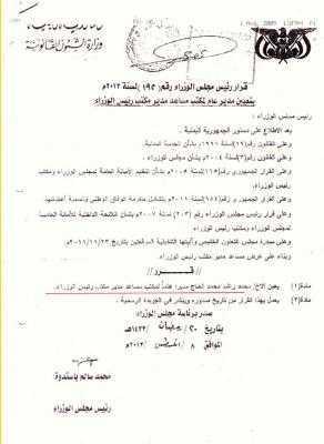 حيث أصدر رئيس مجلس الوزراء قرار برقم (192) لسنه 2012م ، بتعيين محمد راشد محمد الحاج (مديرا عام لمكتب مساعد مدير مكتب رئيس الوزراء) ، رغم أن المذكور موظف في رئاسة الوزراء بنظام (التعاقد) وبوظيفة مساعد أخصائي بمكتب رئيس الوزراء .