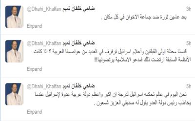 وأضاف خلفان: "قدسنا محتلة أولى القبلتين, وأعلام إسرائيل ترفرف فى العديد من عواصمنا العربية؟ إذا كانت الأنظمة السابقة ارتضت ذلك فمدعو الإسلامية يرتضونها!!".