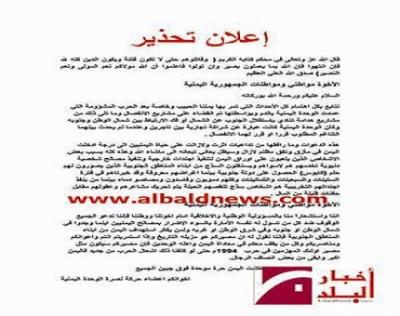 اننا واستشعاراً منا بالمسؤولية الوطنية والاخلاقية امام اخوتنا ووطننا فإننا ندعو الجميع الوقوف ضد كل من تسول له نفسه الأمارة بالسوء الإضرار بمصالح اليمنيين اينما وجدوا في شمال الوطن او جنوبه وفي شرق الوطن او غربه ولمن يفكر استهداف اليمن من ابناء المناطق الجنوبية فإننا نقول له ان مصيركم هو مزبله التاريخ وإذا استمريتم انتم واعوانكم ومناصريكم وكل من يقف معكم في معاداة اليمن واهله الوحدين فإن مصيركم سيكون مثل مصير اولئك المهزمين في حرب 1994م حتى لو كلفنا ذلك اشعال الحرب من جديد فاليمن اكبر وابقى من بعض انصاف الرجال.