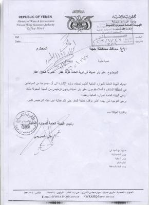 لا نطيل عليكم مرفق لكم عدد من الوثائق التي تبين القضية بالإضافة الى توجيهات النائب العام ومحافظ محافظة حجة وخطابات رئيس الهيئة العامة للموارد المائية.