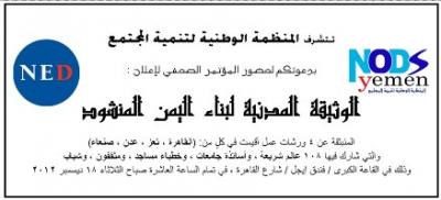 صعدة برس - تعقد المنظمة الوطنية لتنمية المجتمع NODS مؤتمراً صحفياً بالعاصمة صنعاء في العاشرة من صباح غد الثلاثاء للإعلان عن “الوثيقة المدنية لبناء اليمن المنشود” التي أنجزتها بعد نقاشات استمرت 12 يوماً وأحتضنتها القاهرة وثلاث مدن يمنية وشارك فيها 108 شخصاً من علماء وأكاديميين ودعاة ومثقفين وشباب.